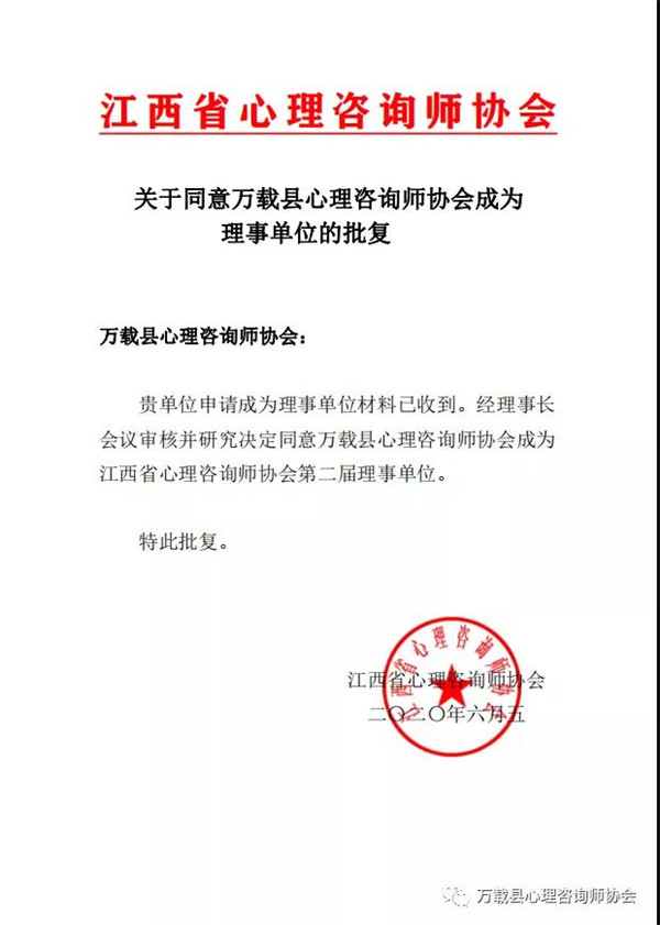 为了推进万载县社会心理服务体系建设,更好地满足人民群众对心理健康服务的需求。2020年万载县心理咨询师协会积极向江西省心理咨询师协会申请成为理事单位,并已获批。今后江西省心理咨询师协会将会对本协会工作开展指导并予以专业支持,协会会员可免费参加江西省心理咨询师协会组织的4次学术交流和4次案例督导。
