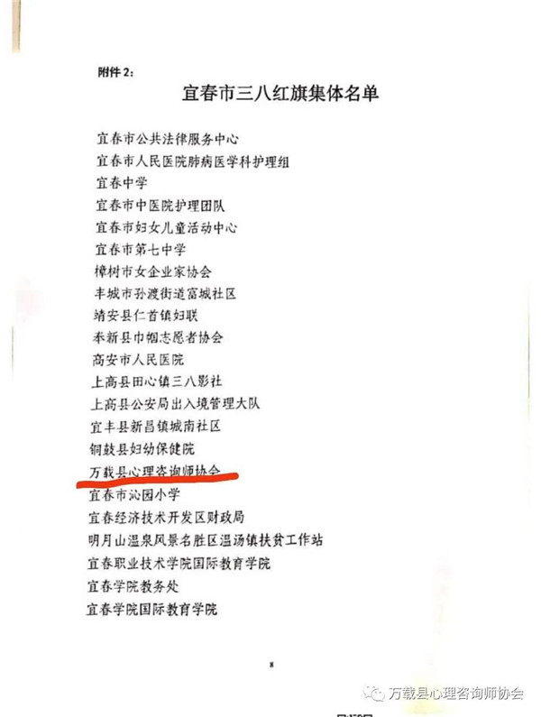 鉴于协会在社会心理服务方面的积极贡献与工作成效,万载县心理咨询师协会被宜春市妇联授予2019年度‘三八’红旗集体荣誉称号。黄穗与郑芬芳两位心理咨询师作为科技志愿者,在阻击新冠疫情期间的应急科普工作中作出的贡献获得了省科协的表彰。