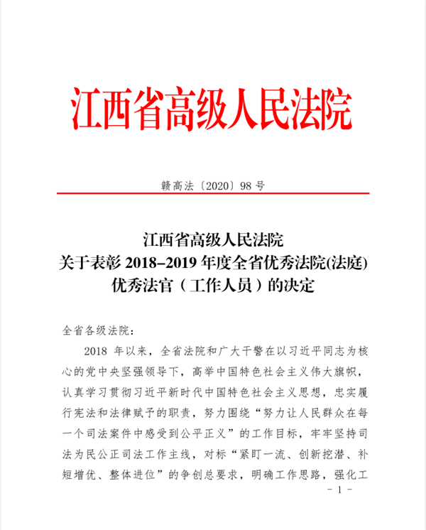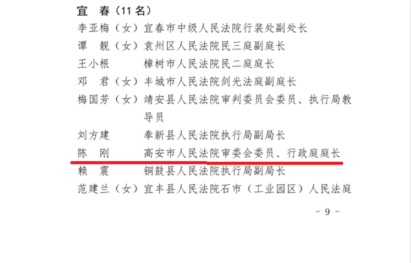近日,江西省高级人民法院下发《关于表彰2018-2019年度全省优秀法院(法庭)优秀法官(工作人员)的决定》,高安市人民法院行政庭庭长陈刚被授予“全省优秀法官”荣誉称号。