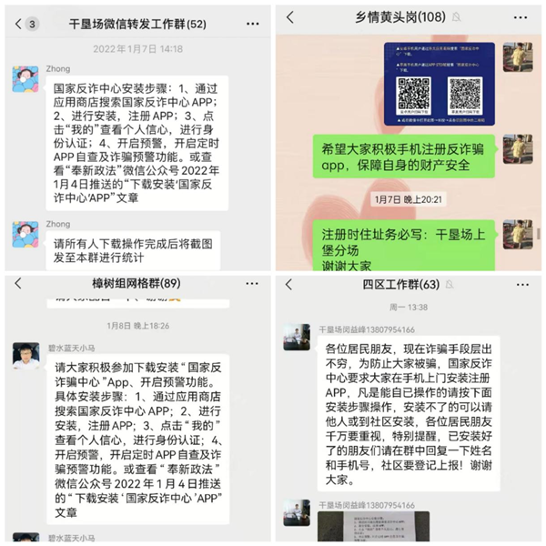 一是充分发挥示范带头作用,积极组织干部职工自行下载安装“国家反诈中心APP”,并动员身边的亲朋好友下载安装“国家反诈中心APP”;二是在村组网格微信群不定时推送反诈宣传内容,积极推送“国家反诈中心APP”安装及操作步骤,引导村(居)民自行下载并注册;三是划分责任片区,细化工作任务,积极组织网格员入户开展宣传,向群众发放“国家反诈中心APP”安装二维码及反电信诈骗资料,面对面向群众介绍“国家反诈中心APP”的使用方法,讲解电信诈骗的新型方式、作案手法等内容,并现场协助安装、注册、完善信息。