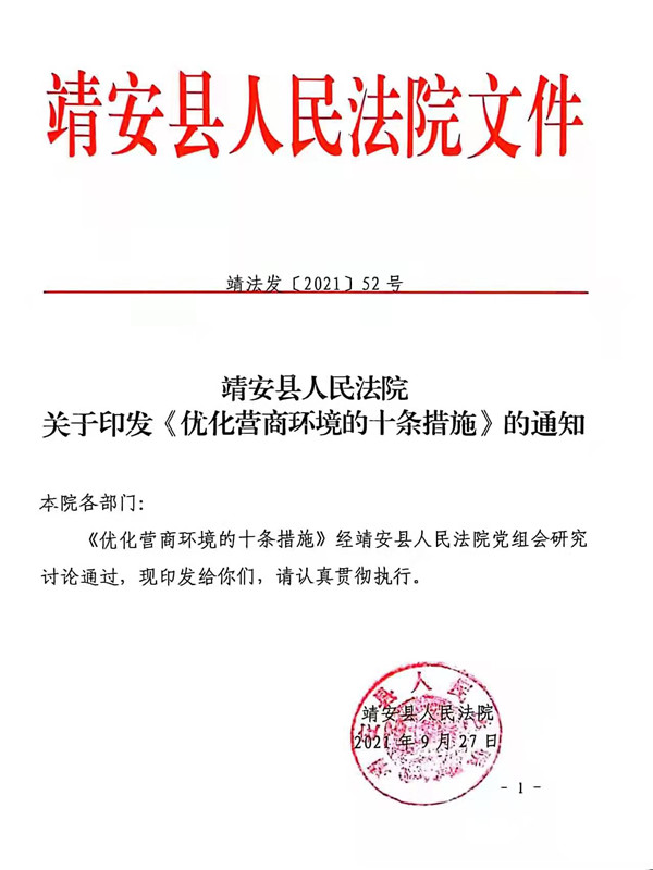 自优化营商环境工作开展以来,靖安法院高度重视、精准发力,通过实施“三个强化”,实现“三个到位”,着力在组织保障、案件办理、服务企业上强措施,全力推进优化营商工作落实落地。今年第一季度,我院民事案件平均审理时间为18.5天,实施类执行案件平均执结时间为10.58天,位列全市第一。
