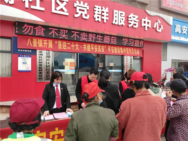 为使广大人民群众理解加强创新社会治理和平安建设的重要意义,不断提升人民群众对平安建设的知晓率和参与度,4月15日上午,高安市八景镇平安建设办联合八景派出所、新华法庭和八景司法所在该镇礼港湖社区开展“喜迎二十大 共建平安高安”平安建设集中宣传月活动。